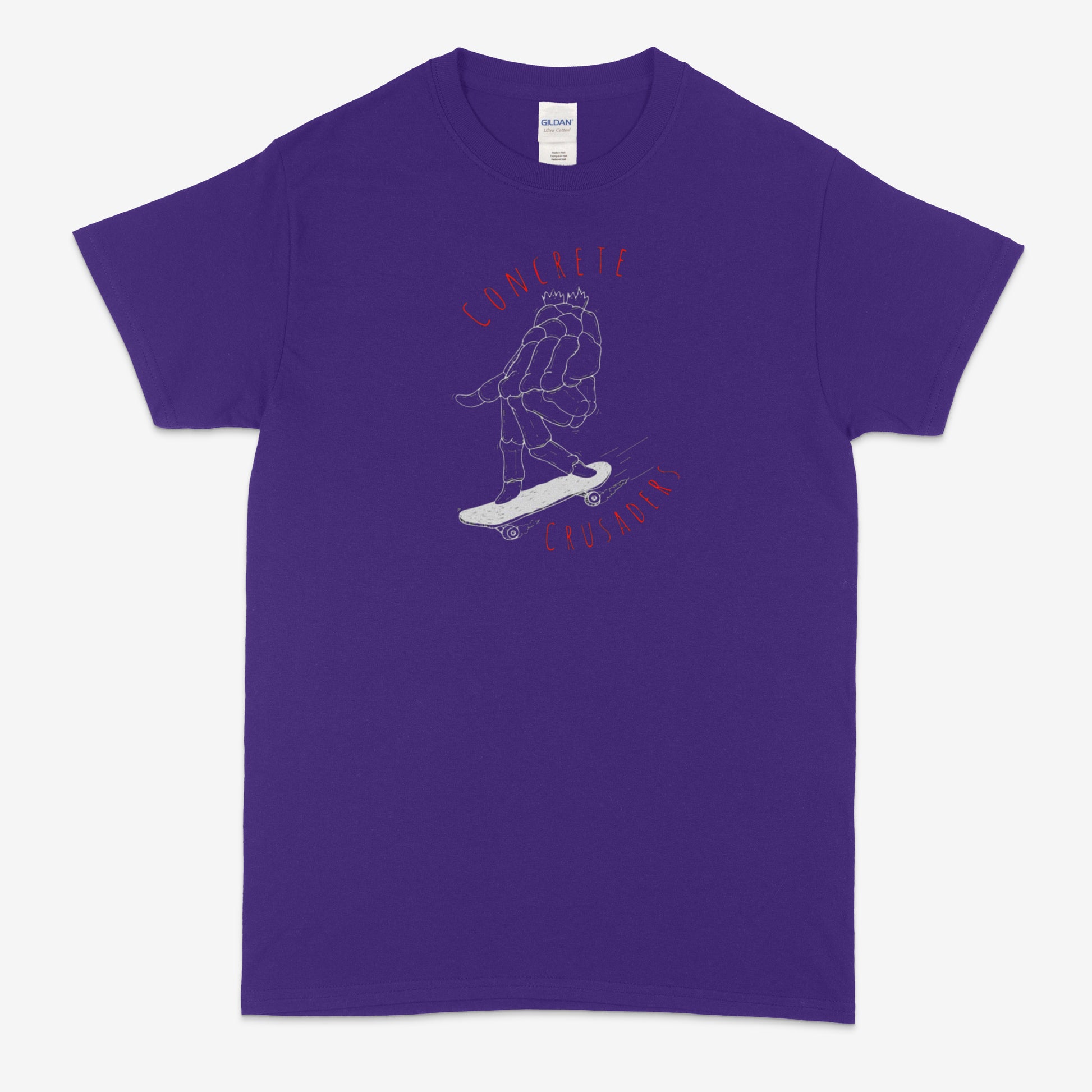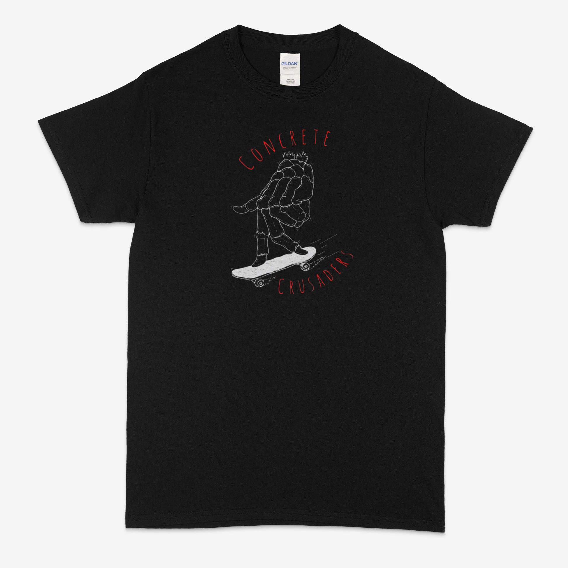Join the movement with the *Concrete Crusaders* tee — a tribute to those who treat the pavement like their playground and the streets like their canvas. Featuring a raw, hand-drawn graphic of a broken skeleton hand mid-ride and bold red text, this shirt captures the fearless spirit of street skating and the unspoken bond of the underground!