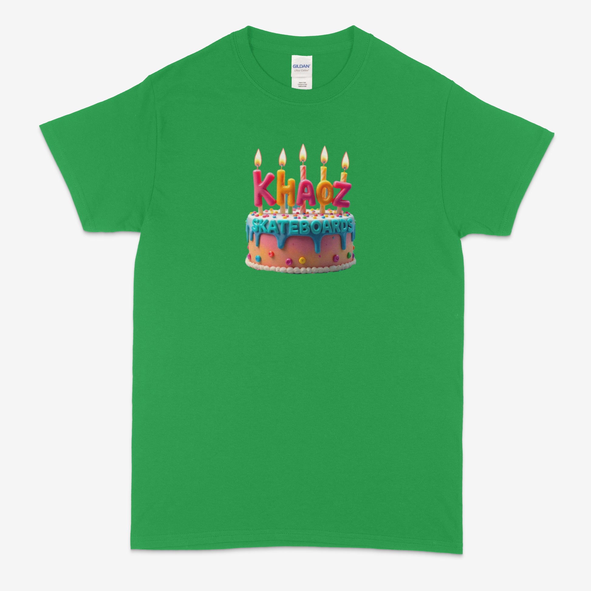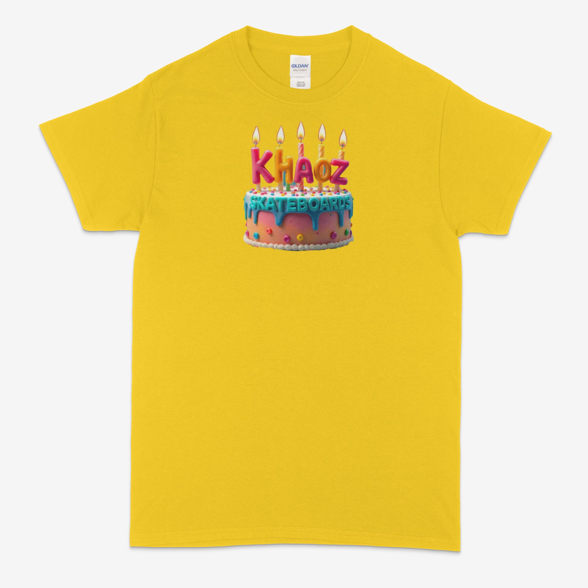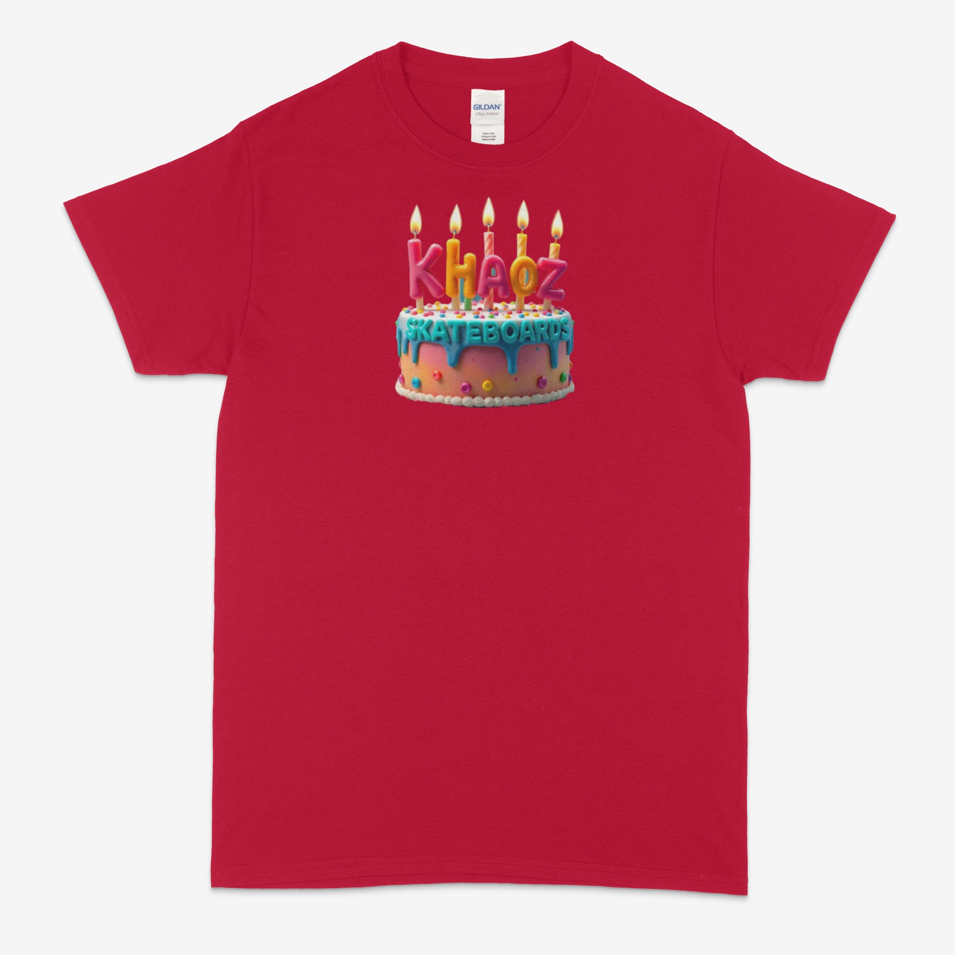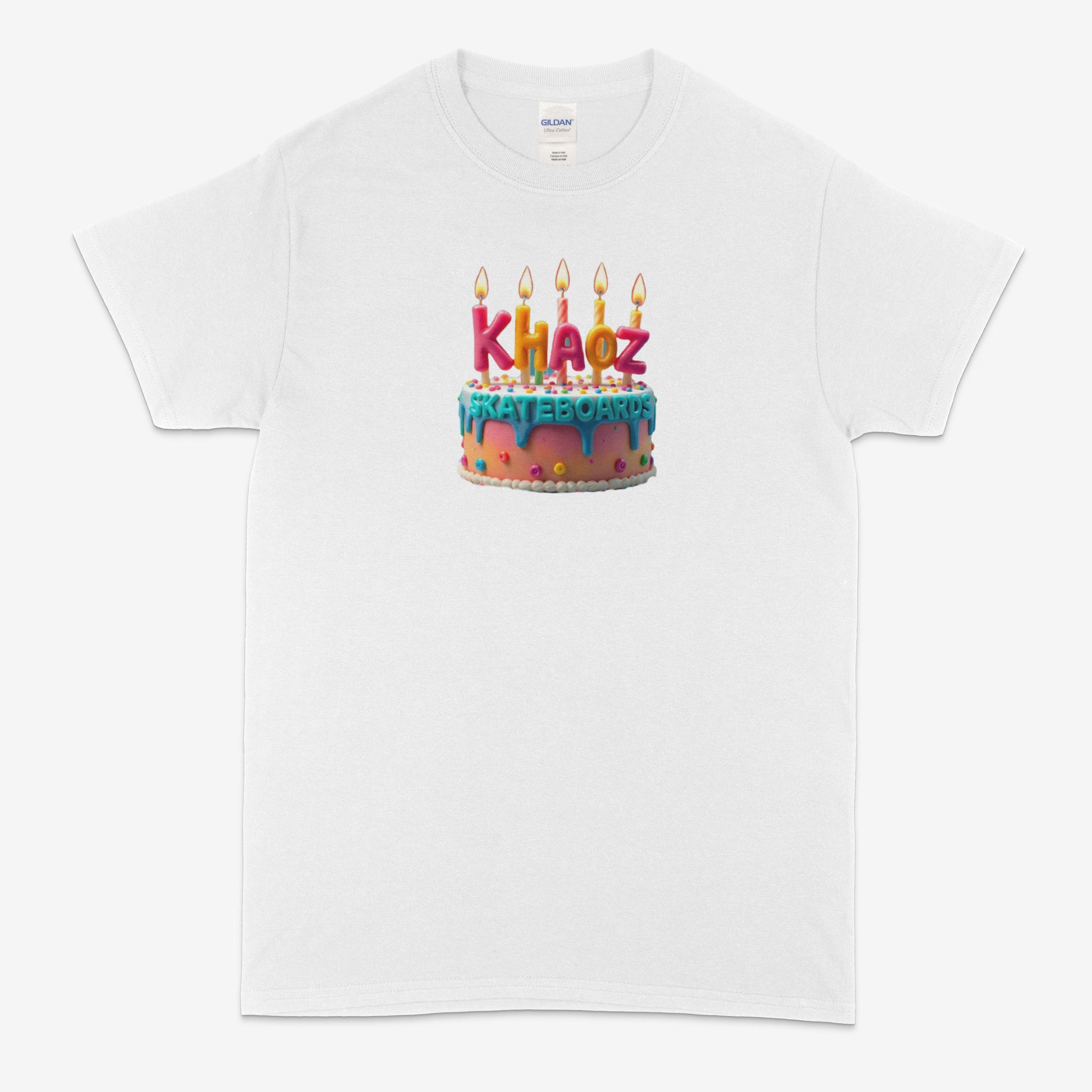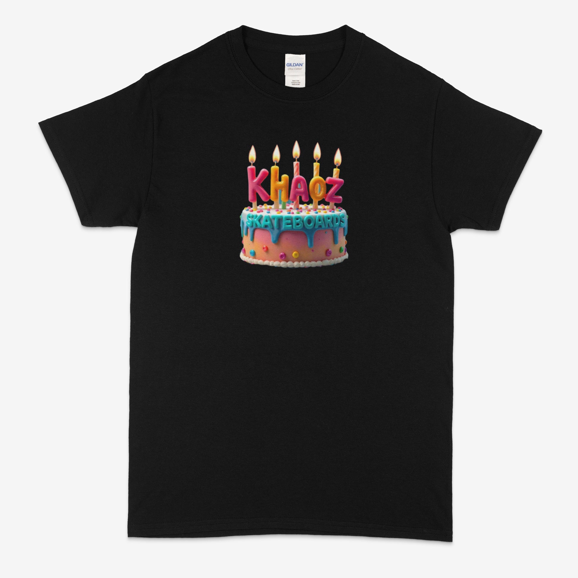 This eye-catching tee features a vibrant, 3D-style birthday cake graphic with bold candle lettering that spells out "KHAOZ" and colorful frosting that screams "SKATEBOARDS". It's a party on a shirt!