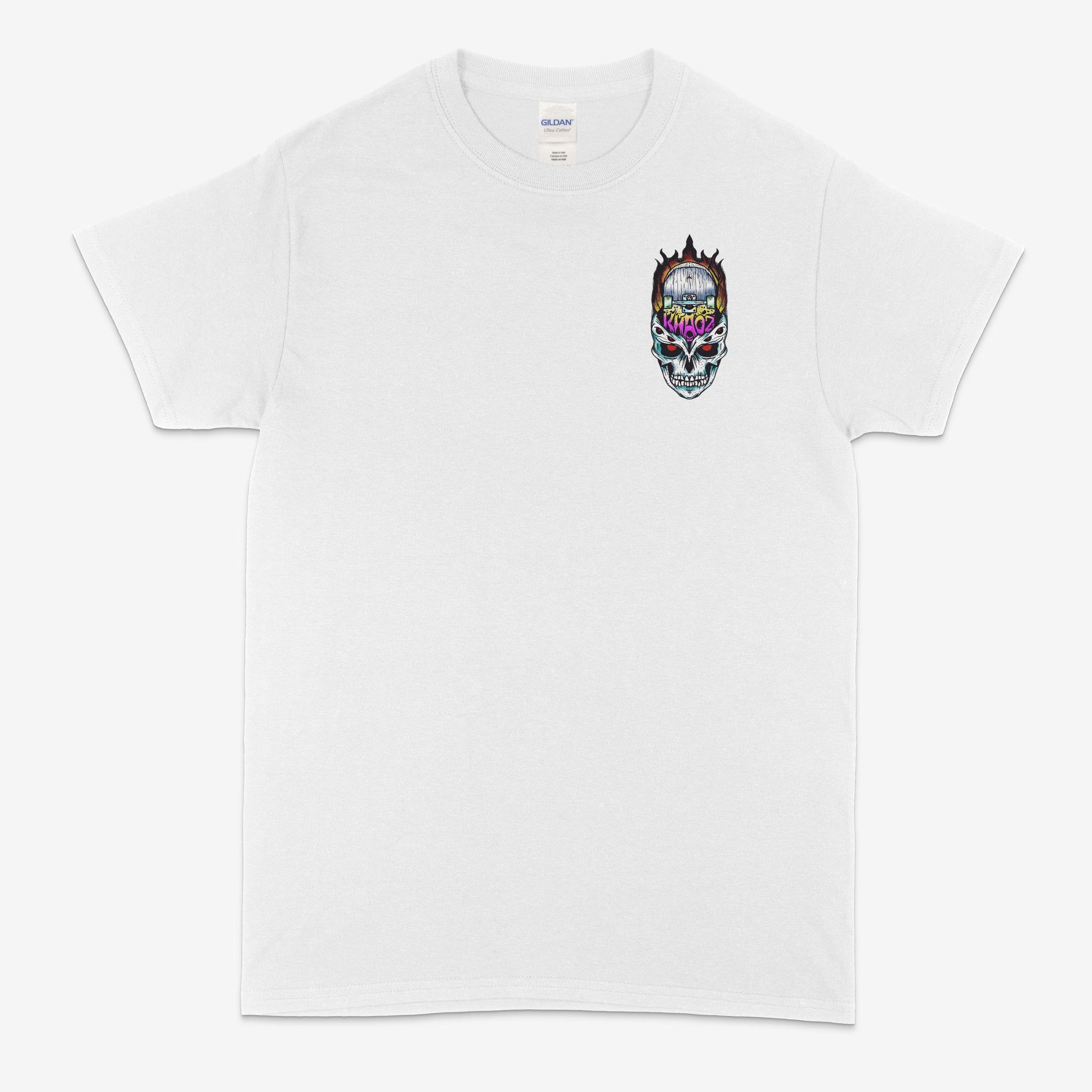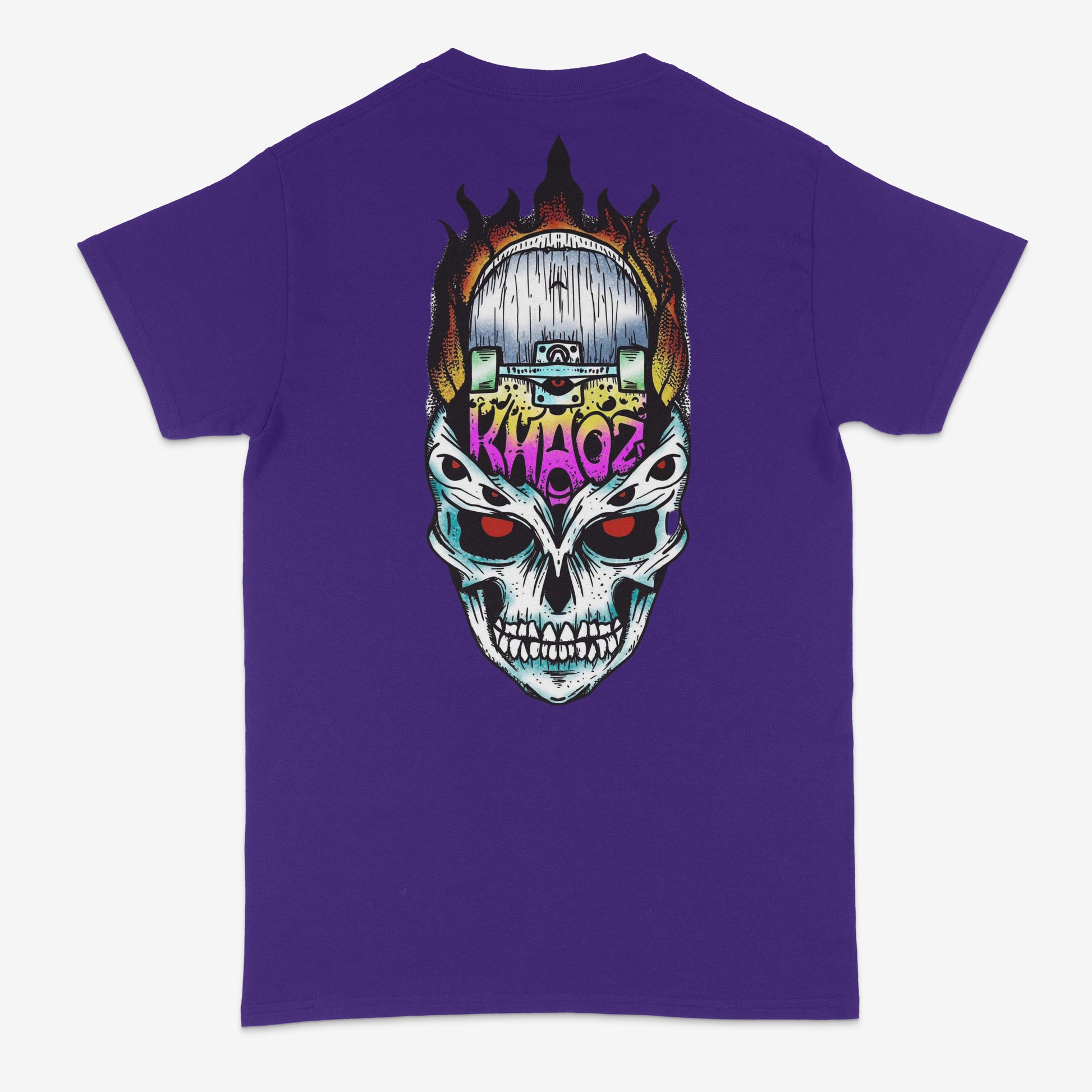 The flaming skull, complete with piercing red eyes and a tagged-up skateboard embedded in its head, screams "KHAOZ" in graffiti-style lettering β the ultimate symbol of skate chaos and underground edge.