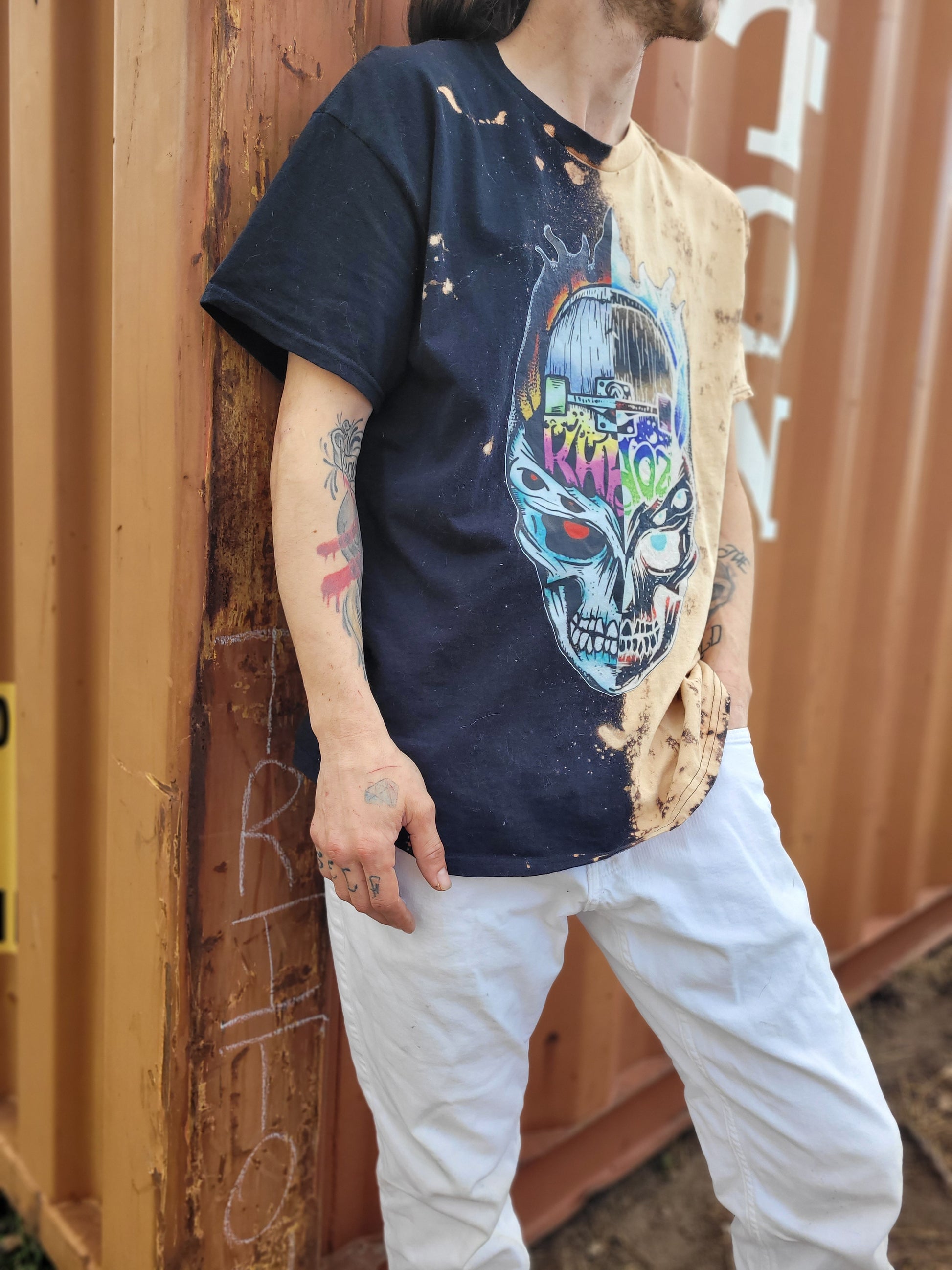 Skate culture meets raw street energy in the Khaoz Split Skull Tee — a one-of-a-kind, hand-treated masterpiece that turns heads and breaks rules. Featuring a split-dye design with scorched bleach effects, this tee blends gritty black and dusty tan like a battle-scarred canvas.